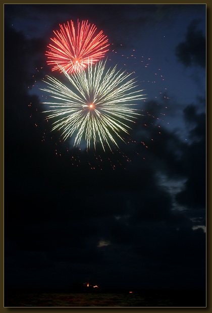 Ein Feuerwerk wirkt umso eindrucksvoller, wenn es von einem rollenden Dampfer aus abgefeuert wird.
