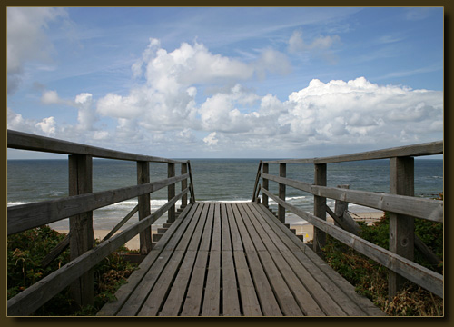Über solche Stege erreicht man in der Regel den Strand. Das hat den Vorteil, dass man keinen Sand in die Schuhe kriegt und so nicht die halbe Dünenlandschaft in seiner Fußbereifung mit in’s Hotel schleppt (von wo sie der Concierge dann eigenhändig wieder in die Düne schleppen müsste). Diese Maßnahme hat die Hotelpreise auf Sylt auf das heutige Niveau reduziert.